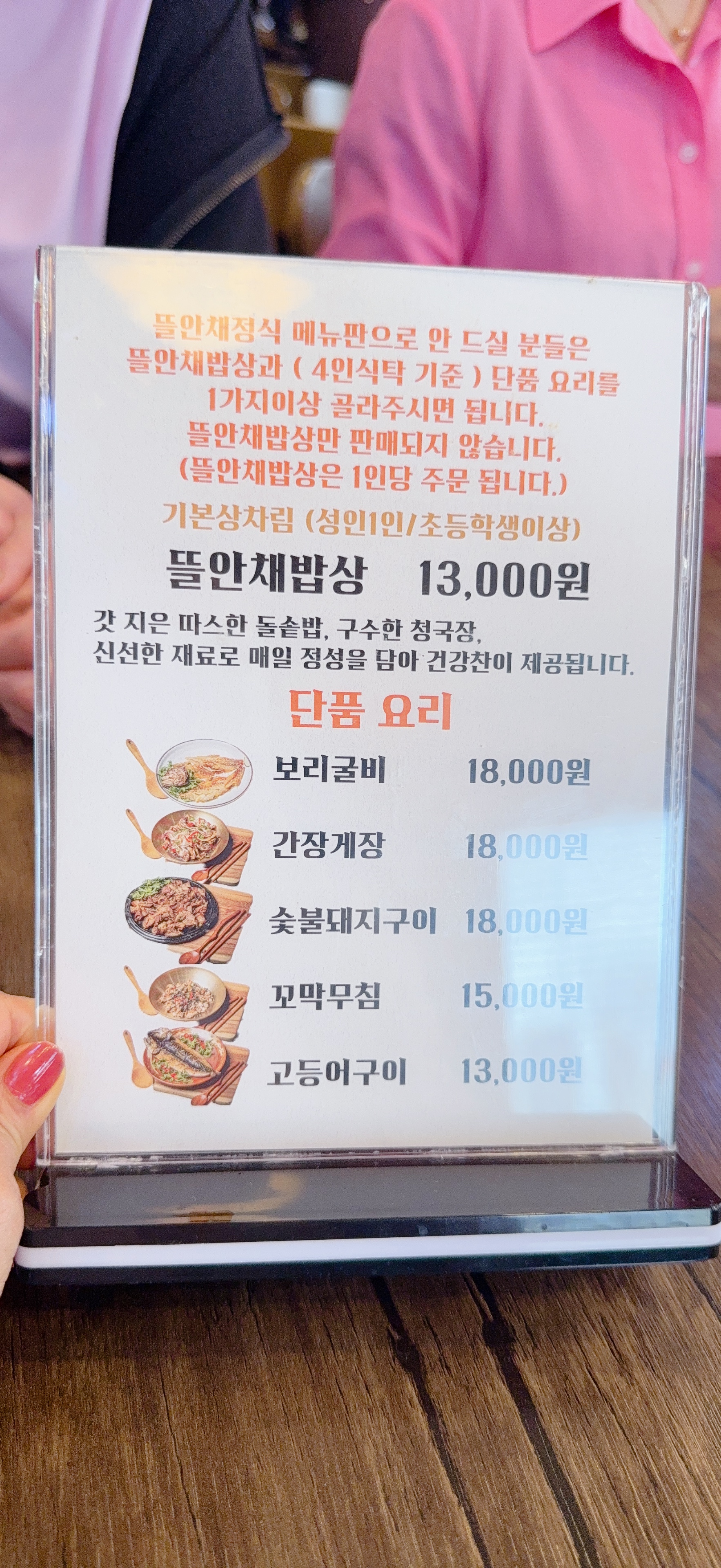 이곳의 대표 메뉴는 뜰안채정식으로, 2인 이상 주문이 가능하고 메뉴 교차도 가능하다는 점이 유연해서 마음에 들었다.